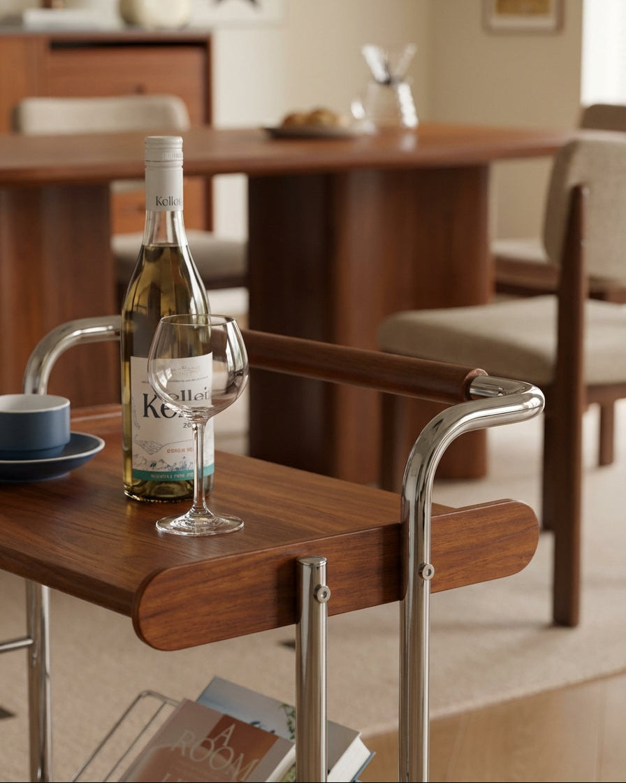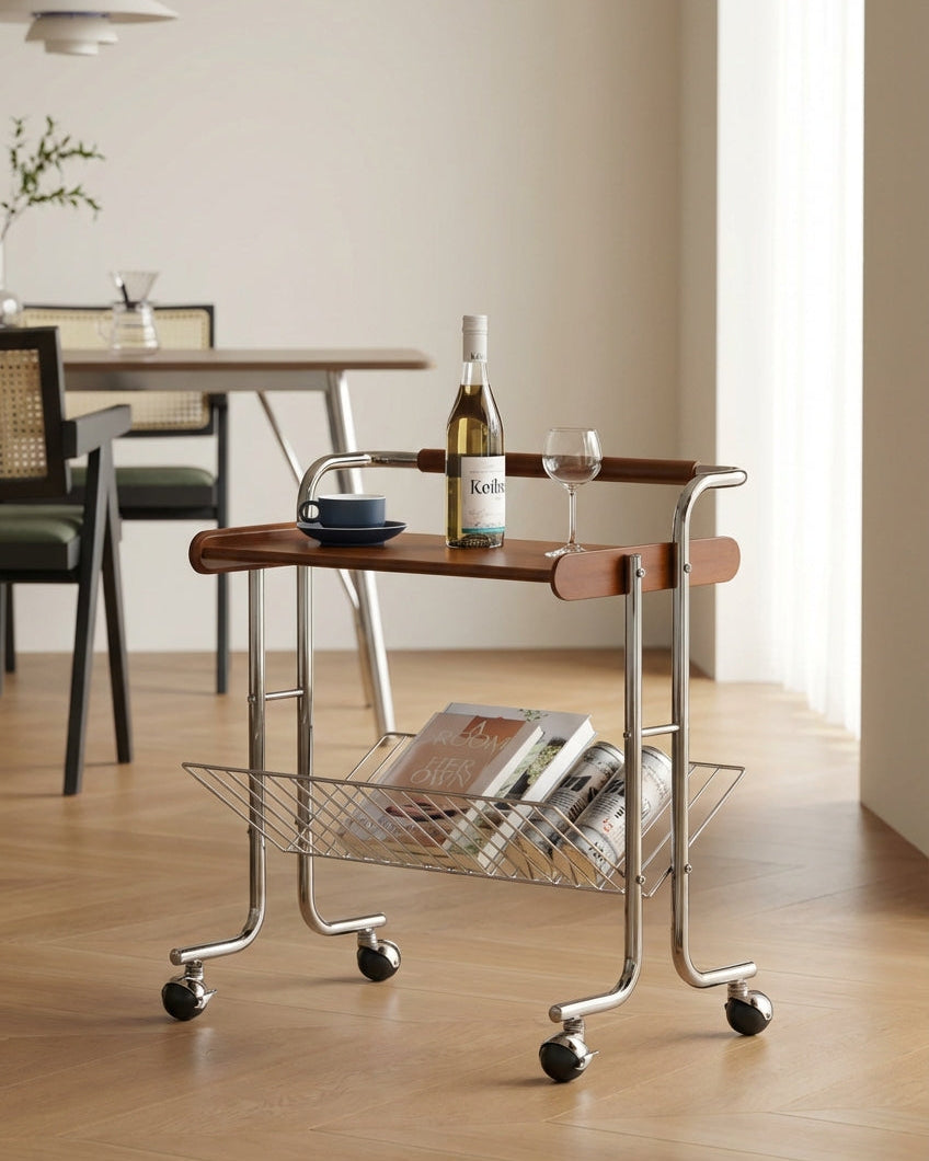 The Milo Vintage Bar Cart with Wheels combines solid wood craftsmanship and a durable stainless steel frame for lasting use. Its 360° swivel wheels offer easy mobility, while the open two-tier design provides practical storage. Ideal for serving, organizing, or as a stylish side table, this cart enhances both function and style in your home.