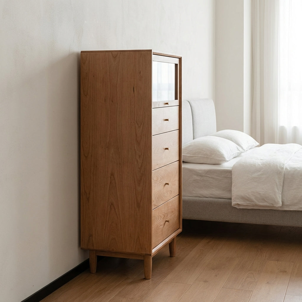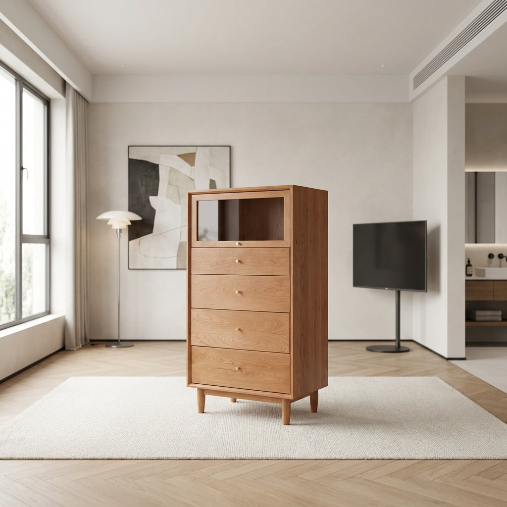Introducing the Grimm Chest Drawer - the perfect blend of style, quality, and functionality. Crafted from SUP grade cherry wood, this Scandinavian-inspired masterpiece will add a touch of elegance to any room.