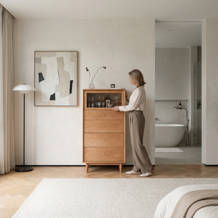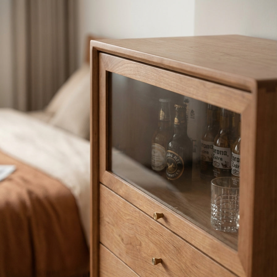 The Grimm Chest Drawer features a flip-top door made of glass. This design allows for easy storage while also enabling you to display your items. It suits various scenarios, adding both functionality and style.