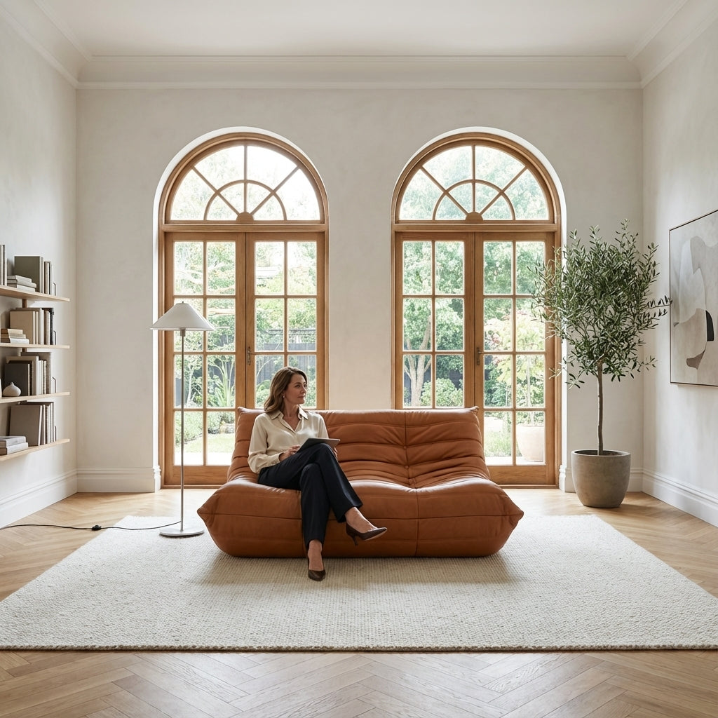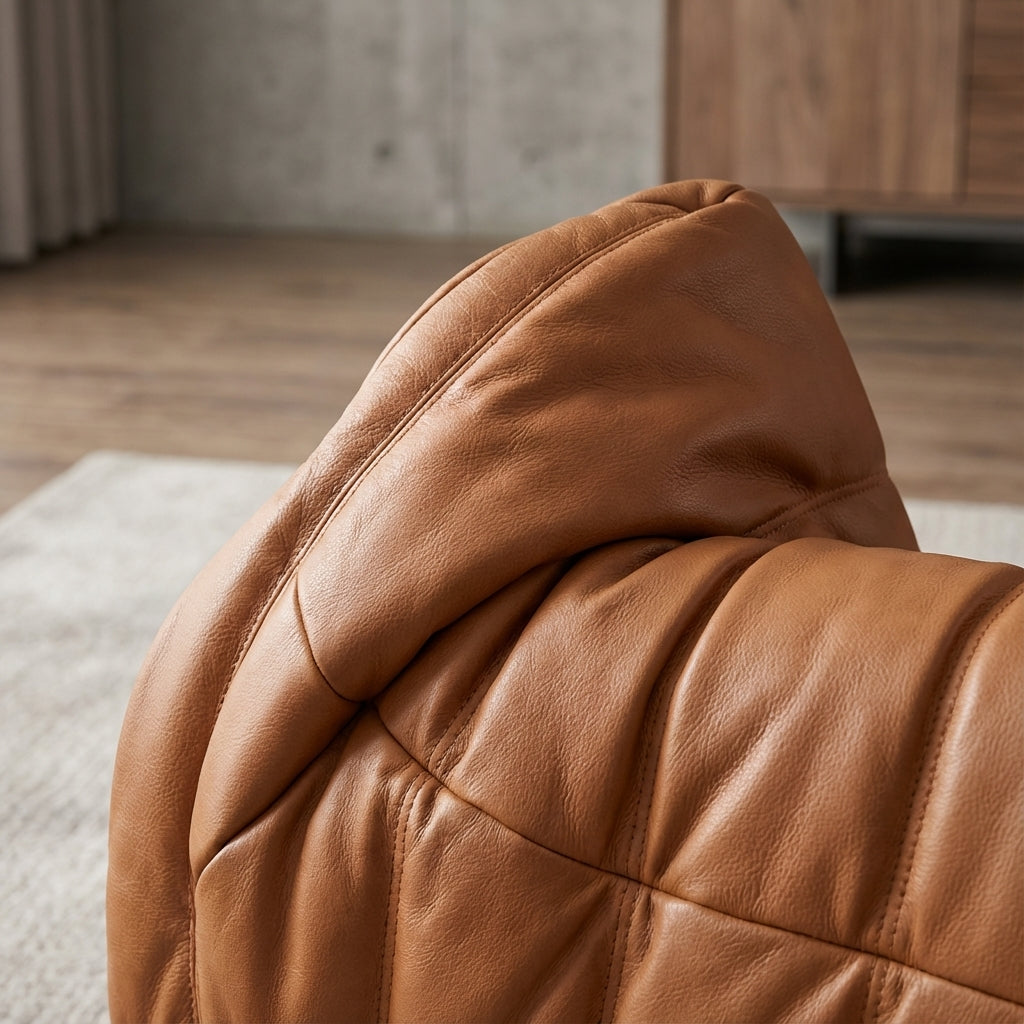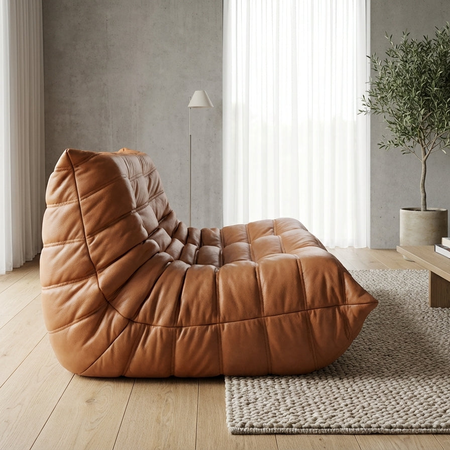 The multifunctional lazy sofa has become the trend of people's leisure and entertainment after getting off work every day. This genuine leather sofa is one of the most popular types. Living room, bedroom, home office, dorm room, balcony, and outdoors, it can be used almost anywhere for watching TV, playing games, using a laptop, or sleeping. The loveseat has a bucket seat that wraps your hips nicely and provides excellent comfort. Made of high-resilience foam wrapping fabric, it will not deform even after prolonged use. It's a replica of the Togo chair.