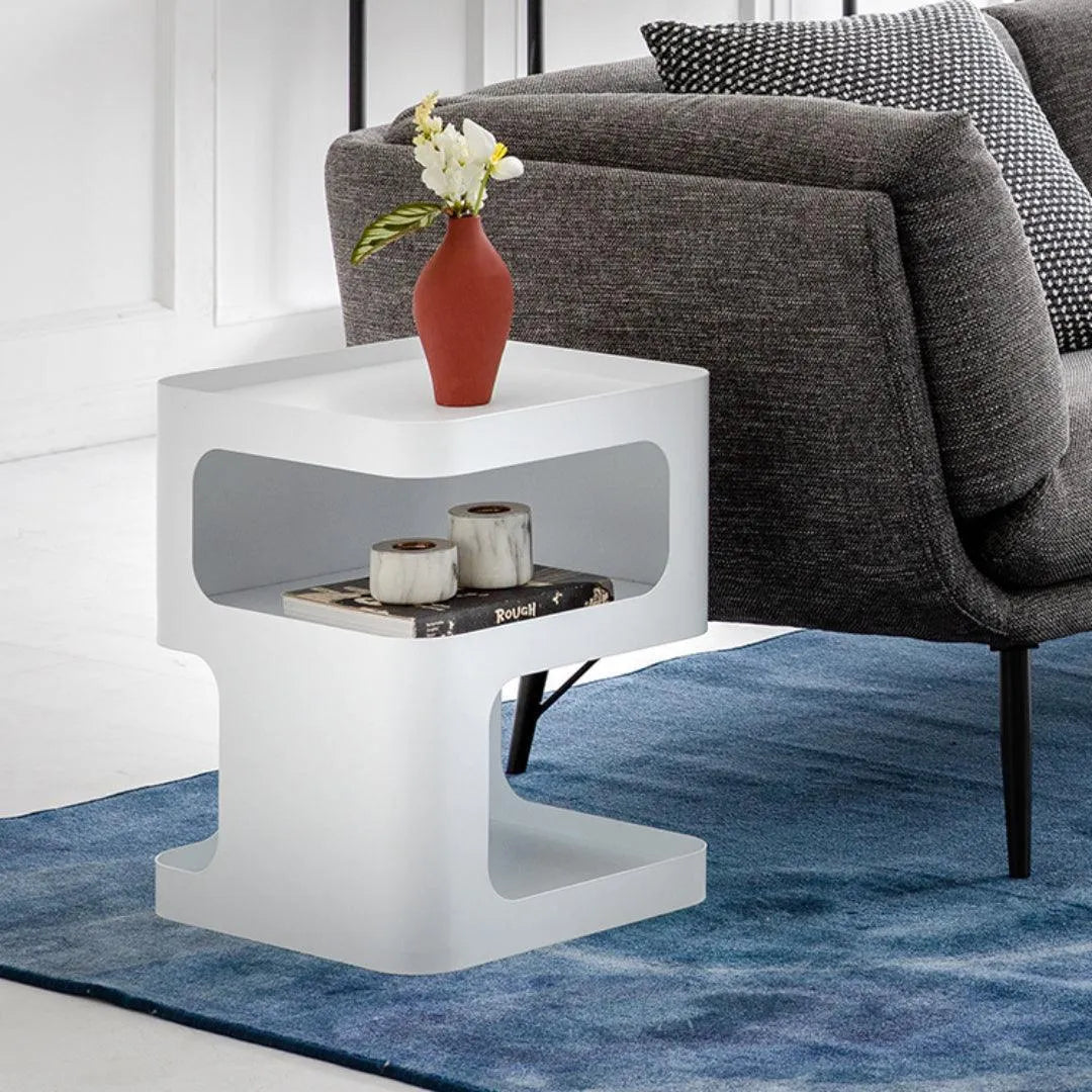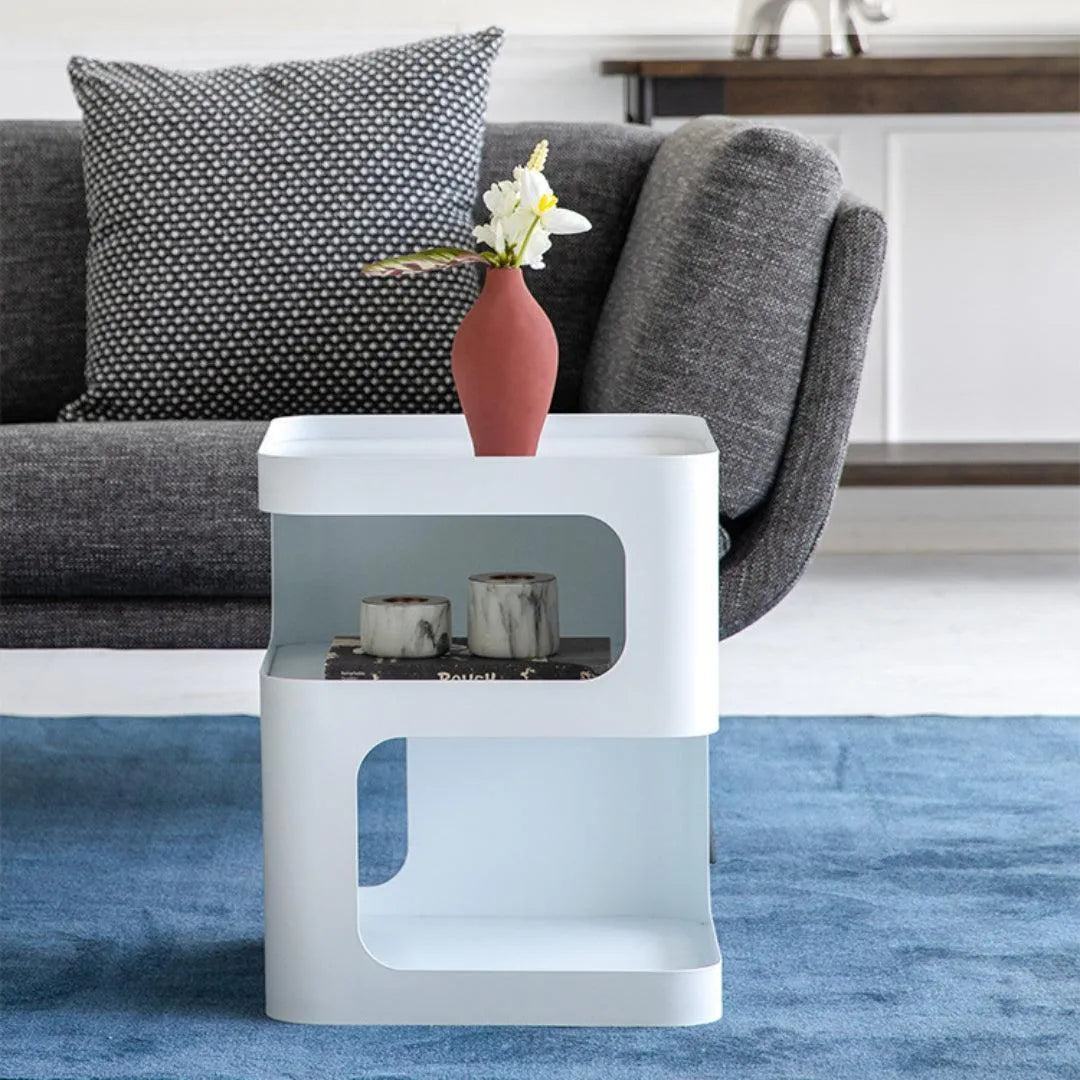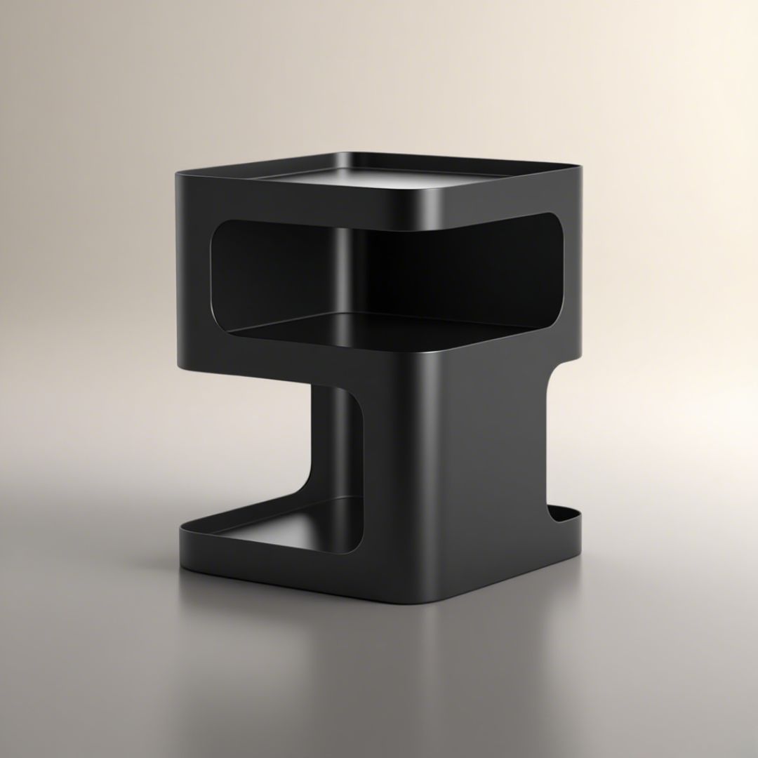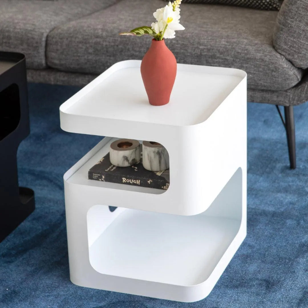 The design is based on a three-dimensional concept, with a solid structure and no legs. Featuring a sculptural shape and a minimally toned finish, this piece will add some modern glamour to your room. It allows you to store coffee mugs, novels, or other small items when not in use.