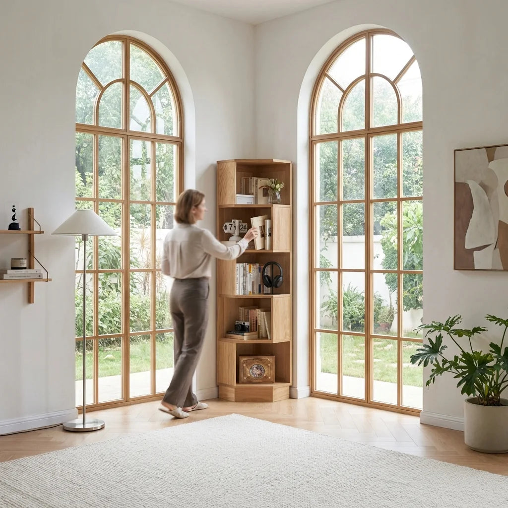 The Stanley Corner Bookshelf is a high-quality corner unit made from durable North American oak. Its 90° design fits flush in corners to save space. Adjustable shelves allow for flexible storage, and the top provides extra space. Suitable for any room, it combines practicality with elegant wood grain.