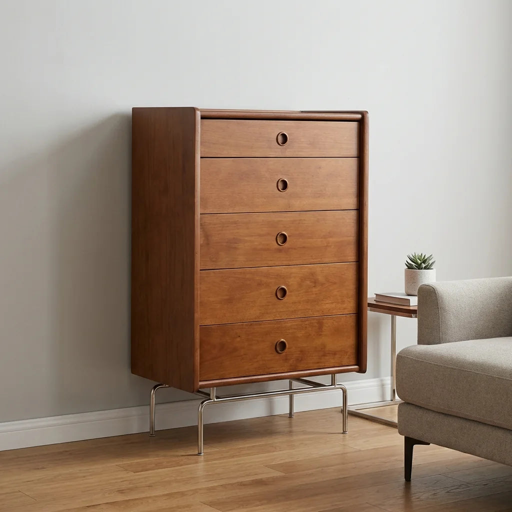 The Hannah 5 Drawer Chest combines style and function with five spacious drawers for organized storage. Its smooth, cushioned drawer operation and sturdy mortise-and-tenon joints ensure durability and quiet use. Elevated 16cm on stainless steel legs, it’s easy to clean underneath. The high-waist design prevents items from slipping, and round handles provide a comfortable grip, making it a refined and practical addition to any bedroom.