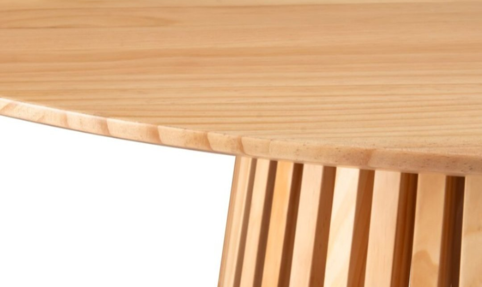 Upgrade your dining area with this sleek round table that combines contemporary design with practicality. Its unique slatted base offers both style and stability, while the premium wood material and compact size make it a versatile addition to any modern interior. Perfect for small spaces, this table can comfortably seat 4-8 people and is suitable for various purposes. Bring a touch of elegance to your dining experience with this versatile table that is built to last.