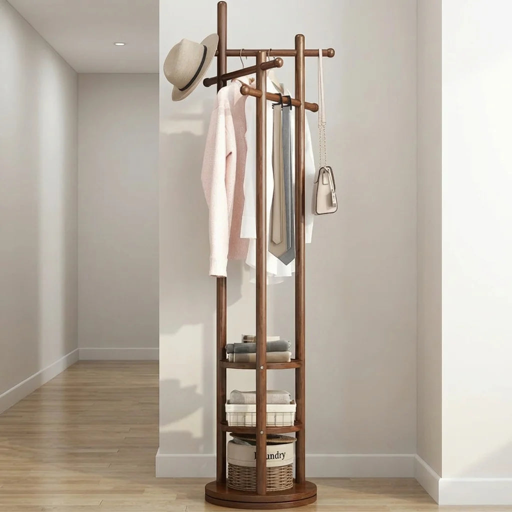 The Mckibben Premium Rotating Coat Rack offers a sturdy, 360° rotating design made from solid wood. Its stable base and smooth hooks protect your clothes while saving space, making it ideal for any entryway or living area.